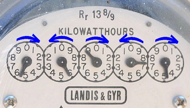 Take a look at the illustration. Note the direction of the hands on each dial as indicated by the blue arrows. The directions alternate from clockwise on the first dial, then counter-clockwise on the second dial, then clockwise again on the third, and so on until the last dial.