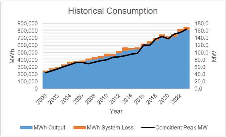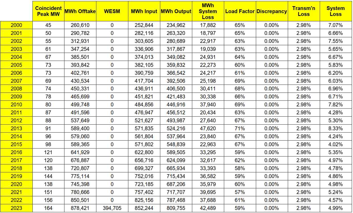 Peak Demand increased from 45 MW in 2000 to 164 MW in 2023 at a rate of 5.9% due to consumer growth. MWh Offtake increased from 260,610 MWh in 2000 to 878,421 MWh in 2023 at a rate of 5.5% due to consumer growth. Within the same period, Load Factor ranged from 57% to 71%. There was an abrupt change in consumption on 2020 due to COVID and Lockdowns.