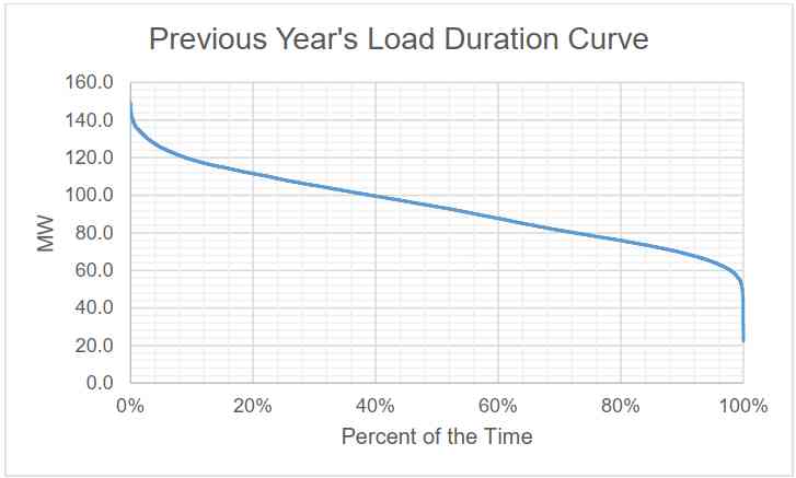 Based on the Load Duration Curve, the minimum load is 55 MW and the maximum load is 140 MW for the last historical year.