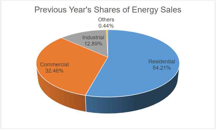 Residential customers account for the bulk of energy sales at 54.21% due to the high number of connections. In contrast, Street Lights customers accounted for only 0.44%% of energy sales due to the low number of connections.