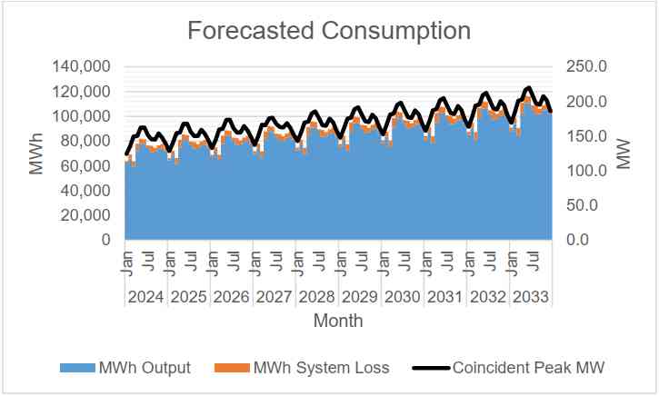 The Peak Demand was forecasted using historical average increase at the rate of 4%. Monthly Peak Demand is at its lowest on the month of January due to cold weather. In general, Peak Demand is expected to grow at a rate of 4% annually.
