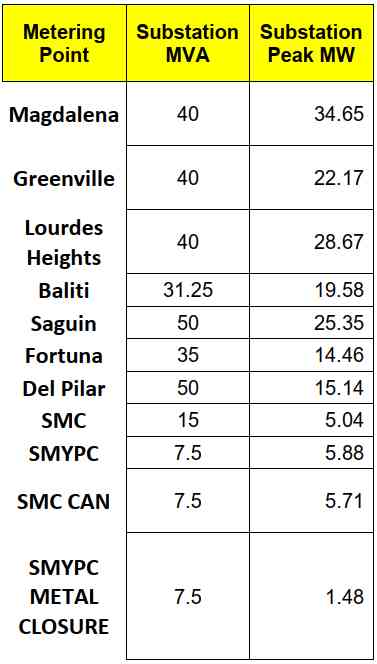 The substations loaded at above 70% is Magdalena. This loading problem will be solved by increasing the capacity of one Substation (Baliti) and then transfer its load to other substations.