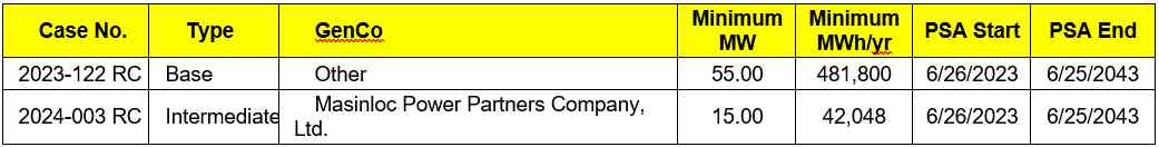 The PSA with MPPCL filed with ERC under Case No. 2024-003 RC was procured through CSP. It was selected to provide for intermediate requirements.