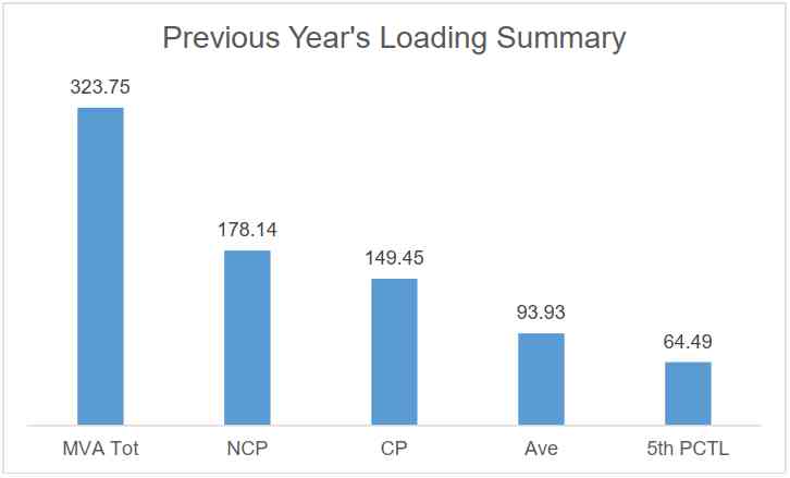 The Non-coincident Peak Demand is 178 MW, which is around 65% of the total substation capacity of 323.75 MVA at a power factor of 85 percent. The load factor or the ratio between the Average Load of 149 MW and the Non-coincident Peak Demand is 65% of. A safe estimate of the true minimum load is the fifth percentile load of 64.49 MW which is 36.23% of the Non-coincident Peak Demand.